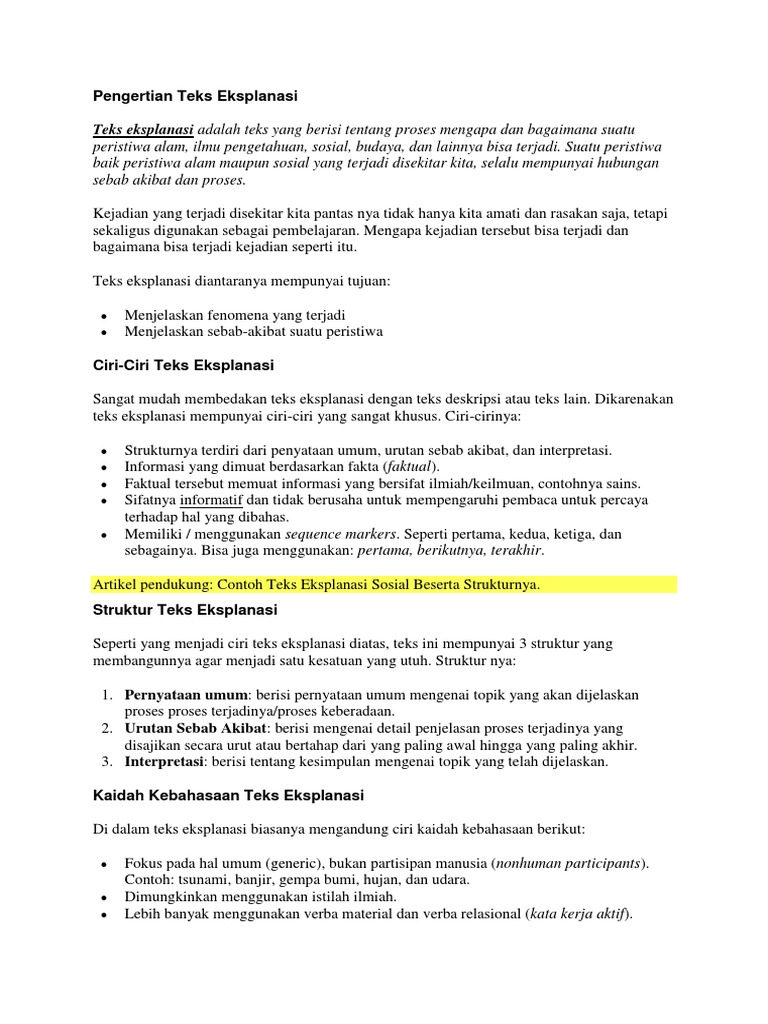 Contoh teks eksplanasi merupakan teks yang isinya berisi penjelasan sebab akibat mengenai sesuatu yang berkaitan secara langsung.